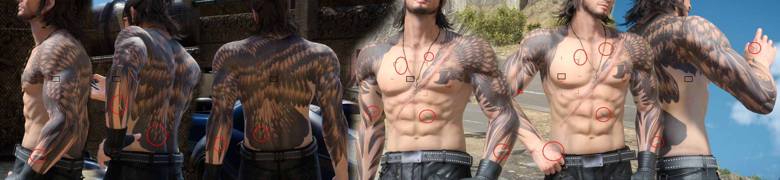 ↠ Below is a compilation of all of Gladio's upper body scars collected from various screenshots of my gameplay